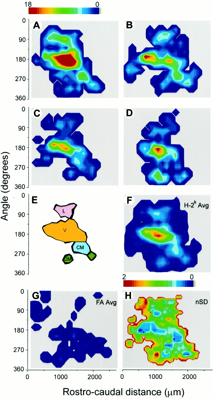 c-fos glomerular activation patterns for H-2k male urine odor in the main olfactory bulbs of H-2d female mice. A-D, F-G, Color contour maps of evoked glomerular activity. A-D, Individual H-2k urine odor maps. F, Average H-2k urine odor map constructed from A-D. E, Diagram illustrating regions of activity in the main olfactory bulb as shown in F. L, Lateral; V, ventral; CM, caudomedial; DM, dorsomedial. G, Control showing average map for mice exposed to fresh air (n = 3). H, Normalized SD (SD/average) map for A-D. Color bar on the top of A shows the density of active glomeruli (number of positive glomeruli per bin) for A-D and F-G. Color bar on the top of H shows the range of the variability (two is most variable) in H.