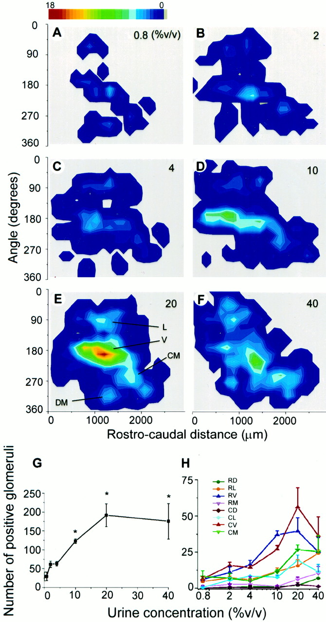c-fos glomerular activation patterns for H-2k male mouse urine odor (concentration-dependent)
