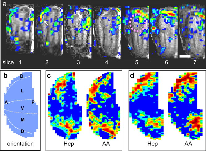 Patterns of 2-heptanone in the MOB and the AOB. a: The patterns elicited by 2-heptonone at 1% (v/v) in seven consecutive coronal slices. The pheromone activates both the MOB and the AOB (pink circle in slice 5). b: Odor map orientation: A, anterior; D, dorsal; L, lateral; M, medial; P, posterior; V, ventral. c,d: Odor maps elicited by 2-heptanone (Hep) and amyl acetate (AA) across the whole MOB in two different mice. Scale bar = 500 uM in a.