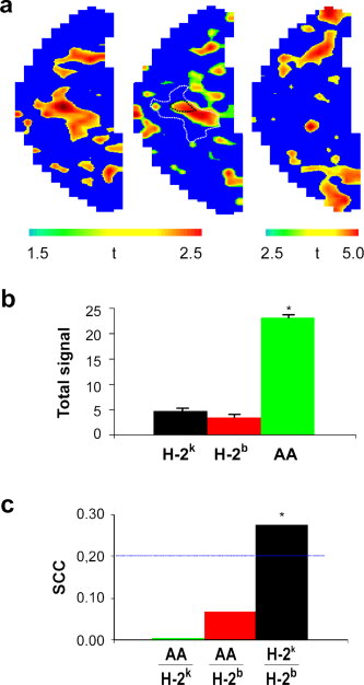 The fMRI patterns elicited in female mice by male mouse urine samples in the MOB. a: The patterns across the glomerular layer of the same animal, elicited by (left to right): urine of strain H-2k, urine of strain H-2b, and amyl acetate (AA) at 1% concentration. b: The total signal elicited in the entire MOB. c: There is significant overlap (*, P < 0.01) in domains of activation between the urine patterns (H-2k/H-2b) but not between the urine and amyl acetate-elicited patterns (AA/H-2k and AA/H-2b). SCC, spatial correlation coefficient.