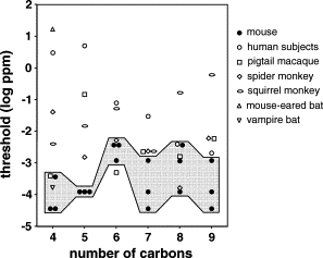 Comparison of the olfactory detection threshold values (expressed as vapor phase concentrations) of the CD-1 mice for aliphatic n-aldehydes and those of other mammalian species (human data: 8; monkey data: 25, 27; bat data: 37). Data points of the three nonhuman primate species and of both bat species represent the lowest individual threshold value reported. Data points of the human subjects represent mean values. Data points of the mice represent the individual threshold values of the three animals tested per odorant. The shaded area indicates the range of individual detection threshold values in the mouse.