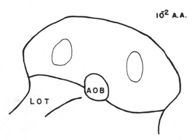 Density patterns in the glomerular layer related to stimulation with amyl acetate (A.A.) odor at 1:100 flow dilution. AOB: accessory olfactory bulb; LOT: lateral olfactory tract. Left olfactory bulb: solid lines; right olfactory bulb: dashed lines.